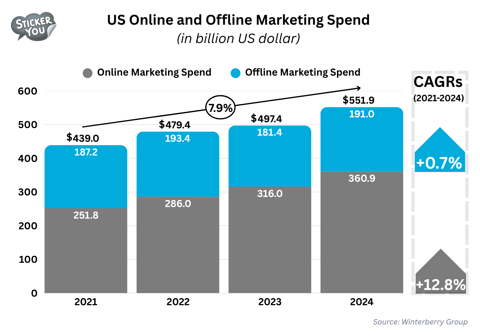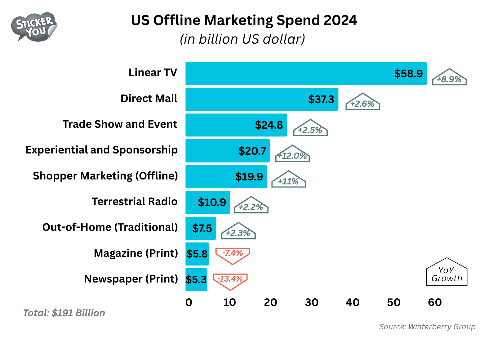• Offline marketing expenditures in the U.S. reached $191.0 billion in 2024, rebounding from $181.4 billion in 2023.