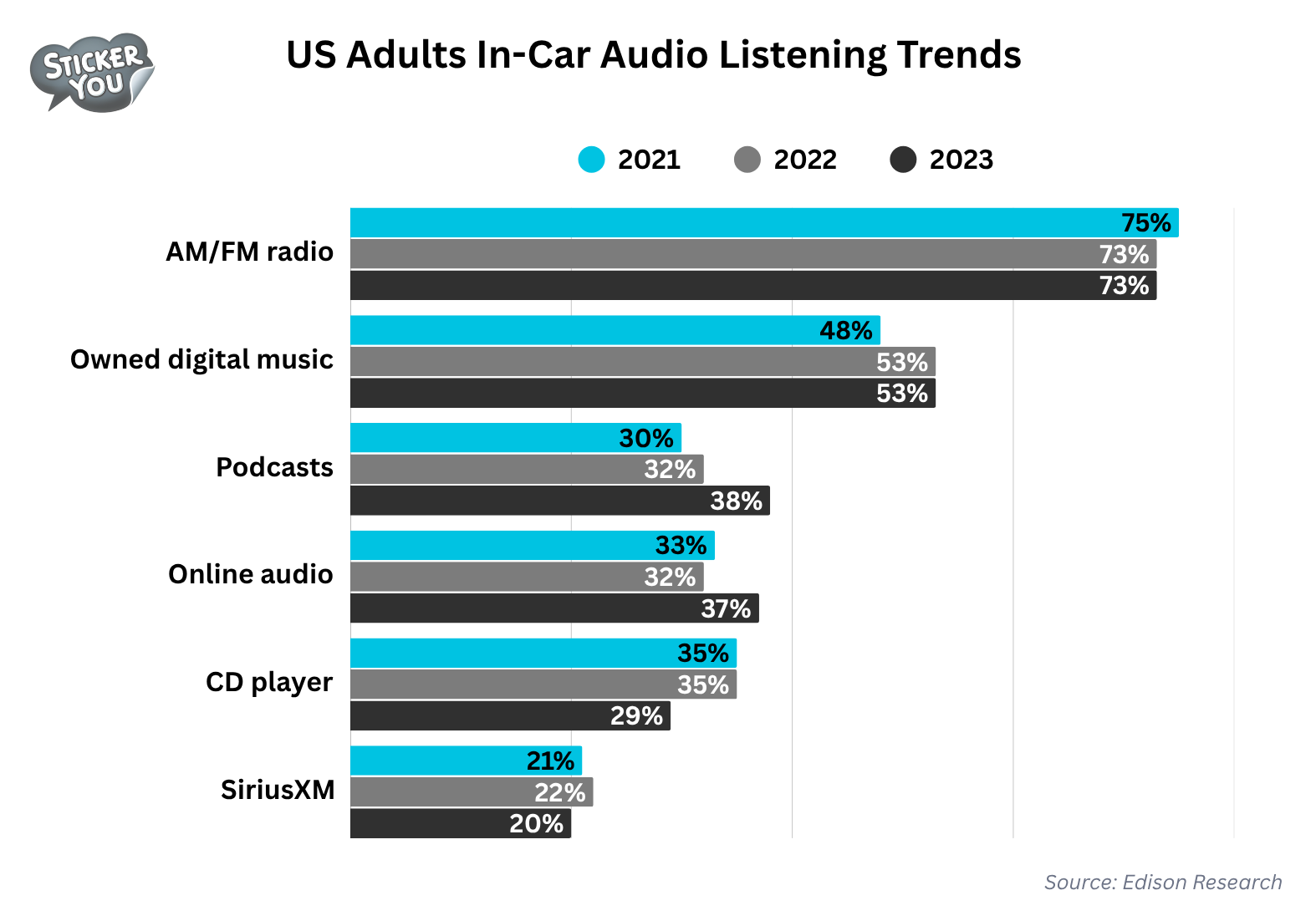 • 73% of U.S. adults reported using AM/FM radio as an in-car audio source.