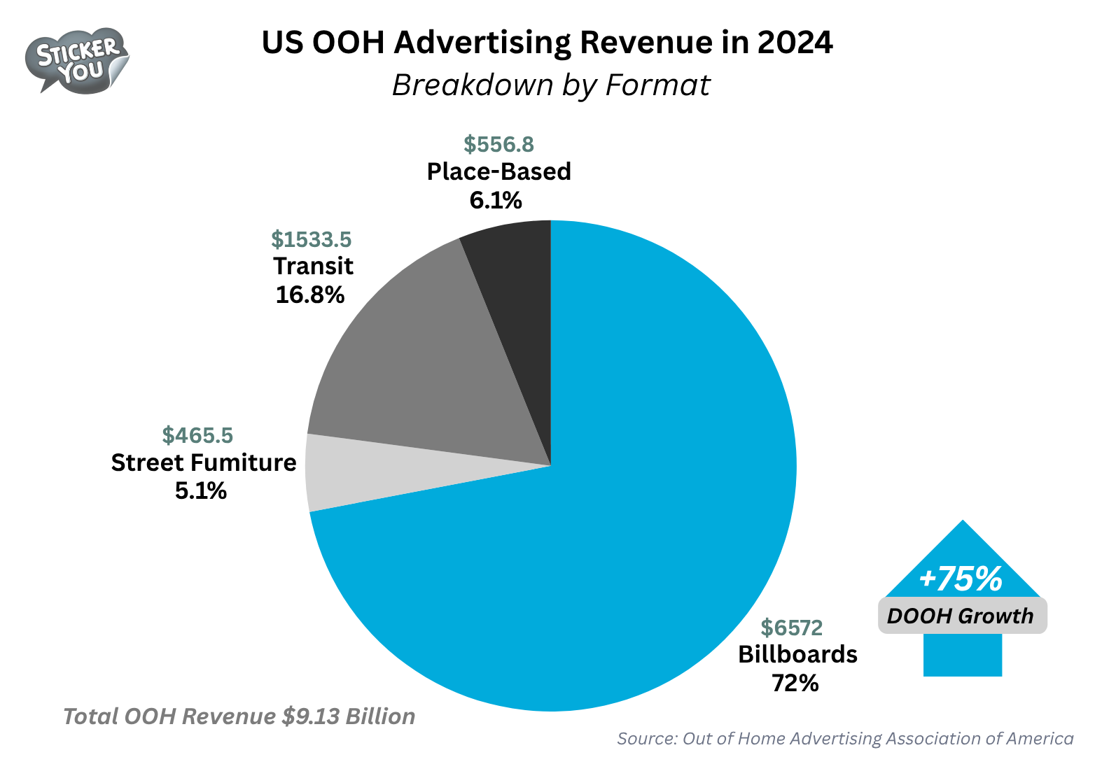 • Billboards continued to be the largest OOH advertising format, contributing 72% (approximately $6.57 billion) to the total OOH revenue in 2024.