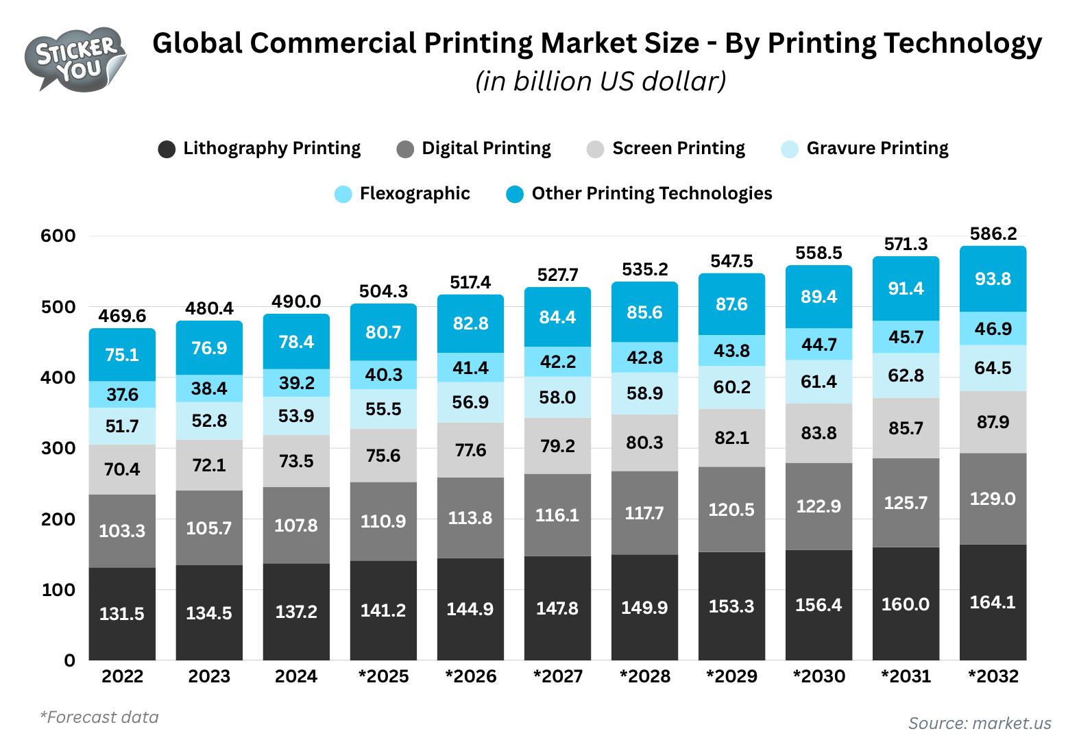 • The global commercial printing market showed varied revenue contributions by technology, with the total market at USD 480.4 billion in 2023 and projected to reach USD 504.3 billion in 2025.