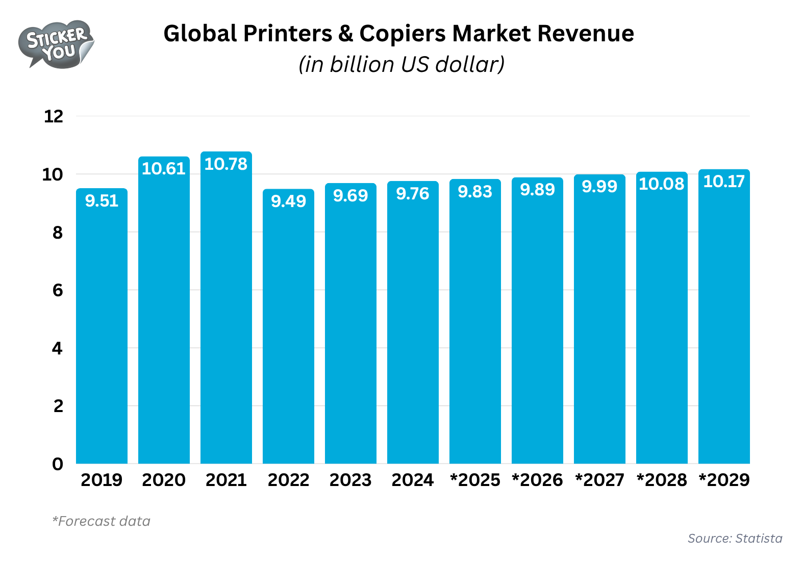 • The global printers and copiers market revenue reached USD 9.76 billion in 2024 and is projected to be USD 9.83 billion in 2025.