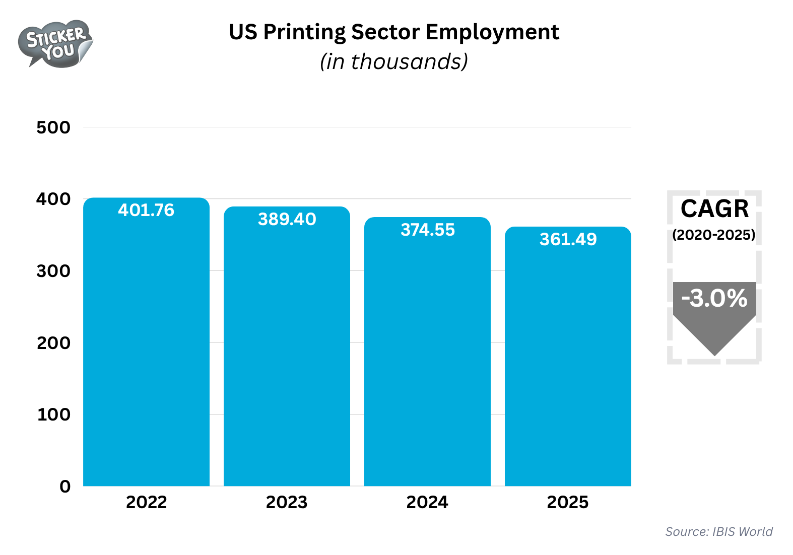 • There were 361,498 people employed in the Printing industry in the US as of 2025.